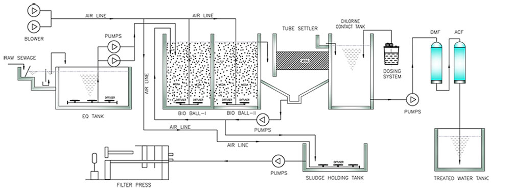 BioBallTM technology is a globally acclaimed and proven successful mode of biological treatment for reducing BOD, Ammonia Oxidation and Nitrogen to the statutory acceptable level. At the core of the technology, specially designed polyethylene biofilm carriers provide a large surface area for micro-organisms to grow on and perform specific biological treatment functions. Carriers are kept in suspension in the reactor either by the aeration system (aerobic zone). Bacteria from the wastewater attach themselves to the floating carriers. The Aeration basins are divided into series which can be 2 or 3 depending on inlet load. The very compact configuration helps to attain a highly active biomass concentration in the reactor and a low settling load in the downstream solids separation process. A constantly operating BioBallTM technology does not require return sludge flows. Fine-bubble aeration in the aeration zone in the wastewater treatment tank provides ease of operation at low-cost. Agitation continuously moves the carrier elements over the surface of the screen inlet/outlet thus preventing clogging. |